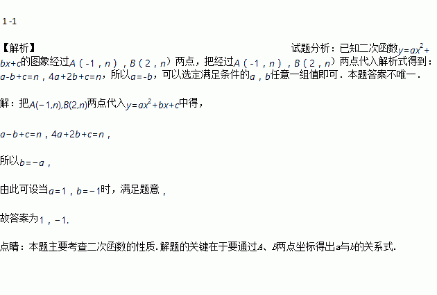 二次函数y=ax2+bx+c(a≠0)图象经过A(-1,n),B(2,n).写出一组满足条件的a、b的值:a=__________,b=___________.