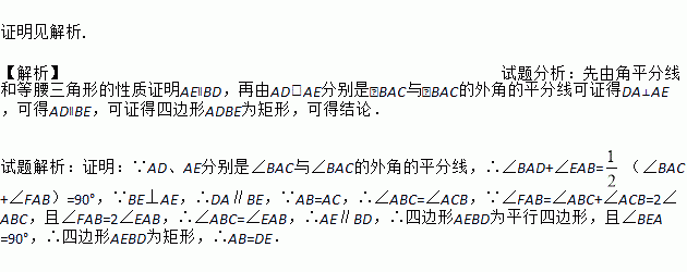 如图,△ABC中,AB=AC,AD、AE分别是∠BAC与∠BAC的外角的平分线,BE⊥AE.求证:AB=DE.