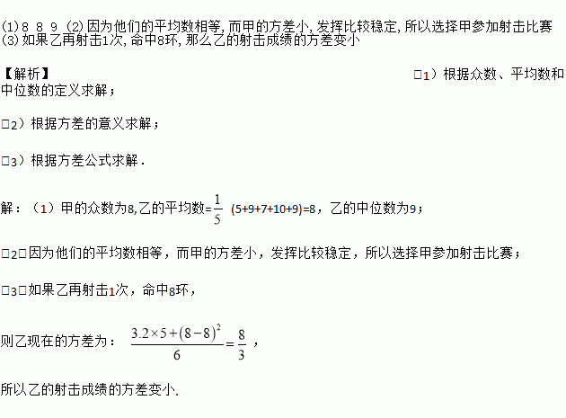 (3)如果乙再射击1次,命中8环,那么乙的射击成绩的方差如何变化?