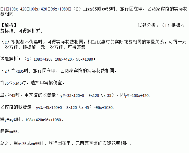 (2)当x取何值时,旅行团在甲、乙两家宾馆的实际花费相同?