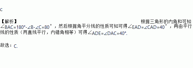 C 【解析】根据三角形的内角和可知∠BAC=180°-∠B-∠C=80°,然后根据角平分线的性质可知可得∠EAD=∠CAD=40°,再由平行线的性质(两直线平行,内错角相等)可得∠ADE=∠DAC=40°. 故选:C.