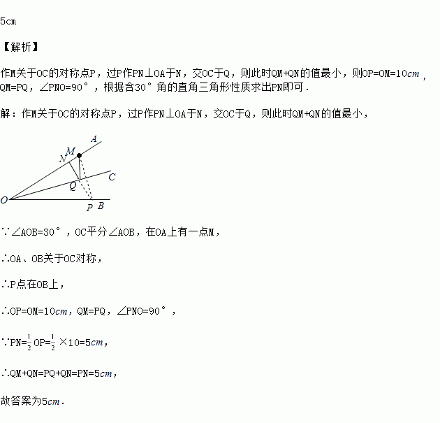 如图,已知∠AOB=30°,OC平分∠AOB,在OA上有一点M,OM=10 cm,现要在OC,OA上分别找点Q,N,使QM+QN最小,则其最小值为________ .