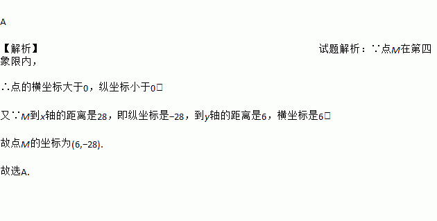 在直角坐标系中,第四象限的点M到横轴的距离为28,到纵轴的距离为6,则点M的坐标为( )