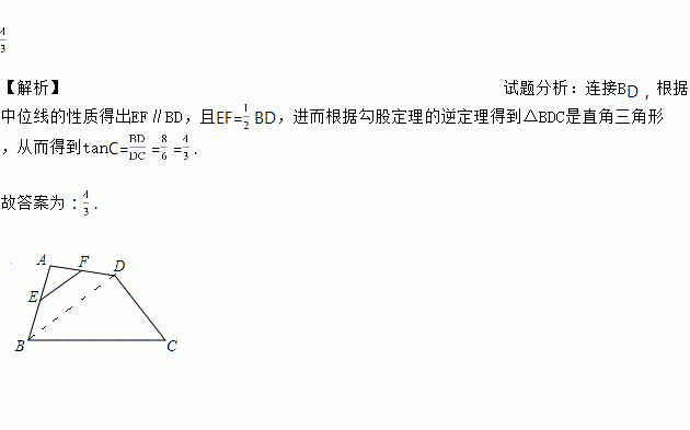 如图,在四边形ABCD中,E、F分别是AB、AD的中点,若EF=4,BC=10,CD=6,则tanC=________