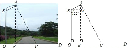 如图,在路边O处安装路灯,路面宽ED为16米,灯柱OB与路边的距离OE为2米,且灯柱OB与灯杆AB成120°角.路灯A采用锥形灯罩,灯罩轴线AC与灯杆AB垂直,并与路面ED交于点C,AE恰好与OD垂直.当路灯A到路面的距离AE为多少米时,点C正好是路面ED的中点?并求此时灯柱OB的高.(精确到0.1米)