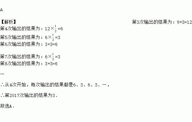 如图所示的运算程序中,若开始输入的x值为15,则第1次输出的结果为18,第2次输出的结果为9,···,第2017次输出的结果为( )
