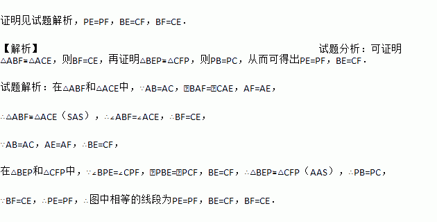 在△ABC中,AB=AC,点E,F分别在AB,AC上,AE=AF,BF与CE相交于点P.求证:PB=PC,并直接写出图中其他相等的线段.