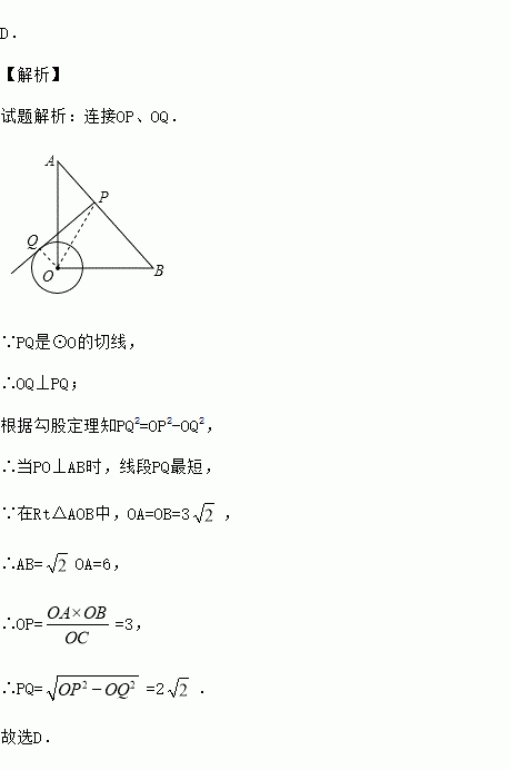 在Rt△AOB中,OA=OB=3,⊙O的半径为1,点P是AB边上的动点,过点P作⊙O的一条切线PQ(点Q为切点),则切线PQ的最小值为( ).