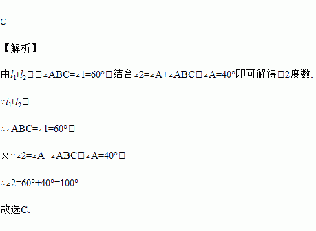 如图,已知l1∥l2,∠A=40°,∠1=60°,则∠2的度数为( )