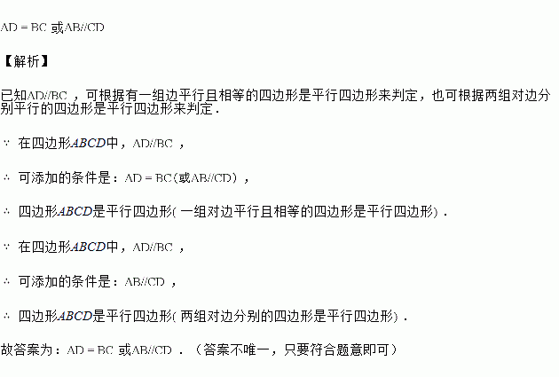 如图,,要使四边形ABCD成为平行四边形还需要添加的条件是______只需写出一个即可