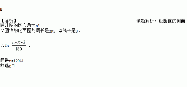 B 【解析】试题解析:设圆锥的侧面展开图的圆心角为n°, ∵圆锥的底面圆的周长是2π,母线长是3, ∴2π=, 解得n=120. 故选B.