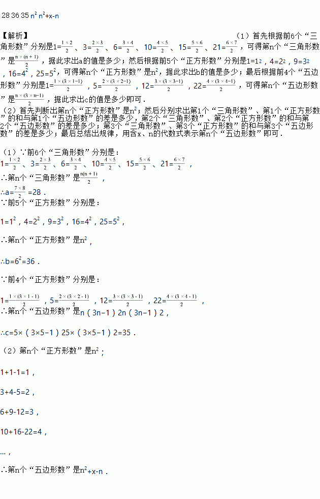 (2)观察表中规律,第n个“正方形数”是_________________;若第n个“三角形数”是x,则用含x、n的代数式表示第n个“五边形数”是 ______________________________.
