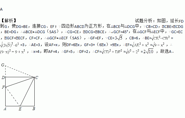 如图,正方形ABCD的边长为6,点E,F分别在AB,AD上,若CE=3,且∠ECF=45°,则CF的长为( )