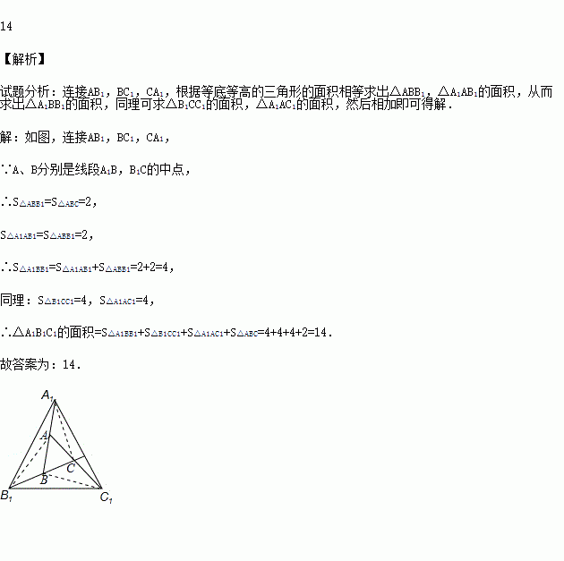 如图,A、B、C分别是线段A1B、B1C、C1A的中点,若△ABC的面积是2,那么△A1B1C1的面积是 .