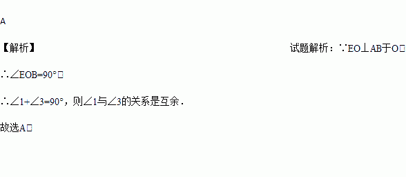 如图,直线AB,CD交于O,EO⊥AB于O,∠1与∠3的关系是( )