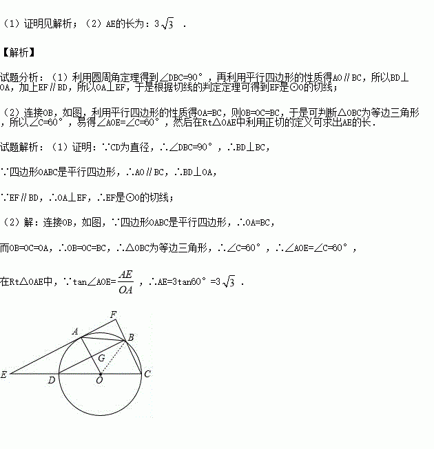 如图,已知⊙O的直径CD=6,A,B为圆周上两点,且四边形OABC是平行四边形,过A点作直线EF∥BD,分别交CD,CB的延长线于点E,F,AO与BD交于G点.