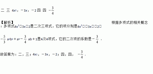 多项式4x2-3x-2是________次________项式,它的项分别是________.