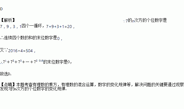 观察下列等式:71=7,72=49,73=343,74=2 401,75=16 807,76=117 649,…,那么:71+72+73+…+72 016的末位数字是( )