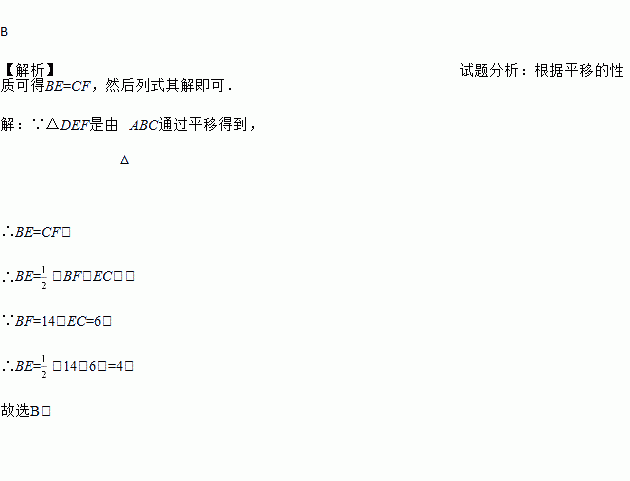 如图,△DEF是由△ABC通过平移得到,且点B,E,C,F在同一条直线上.若BF=14,EC=6.则BE的长度是( )