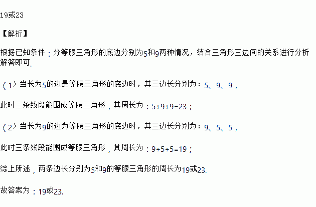 已知等腰三角形的两边长分别为5和9,则它的周长是________.