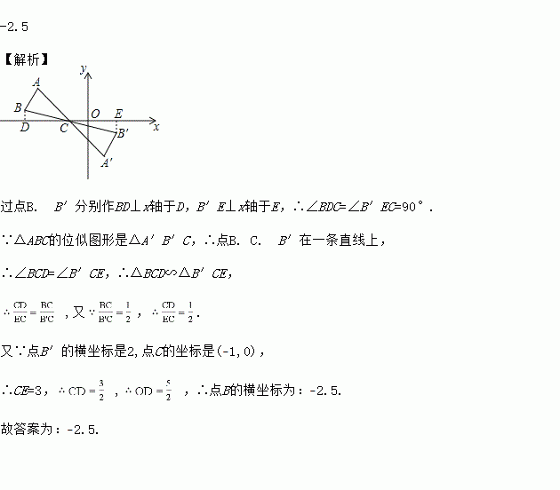 如图,△ABC中,A,B两个顶点在x轴的上方,点C的坐标是(﹣1,0),以点C为位似中心,在x轴的下方作△ABC的位似图形△A′B′C,并把△ABC的边长放大到原来的2倍.设点B的对应点B′的横坐标是2,则点B的横坐标是_____.