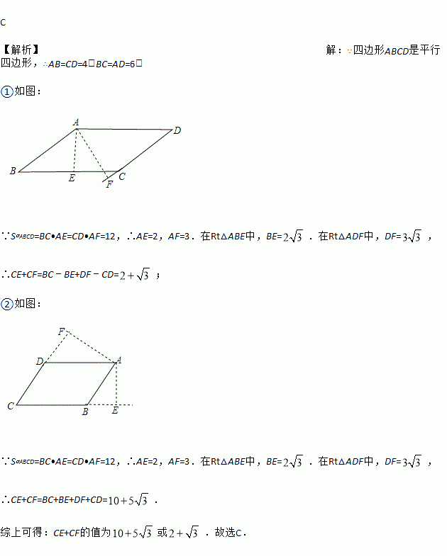 在面积为12的平行四边形ABCD中,过点A作直线BC的垂线交直线BC于点E,过点A作直线CD的垂线交直线CD于点F,若AB=4,BC=6,则CE+CF的值为( )