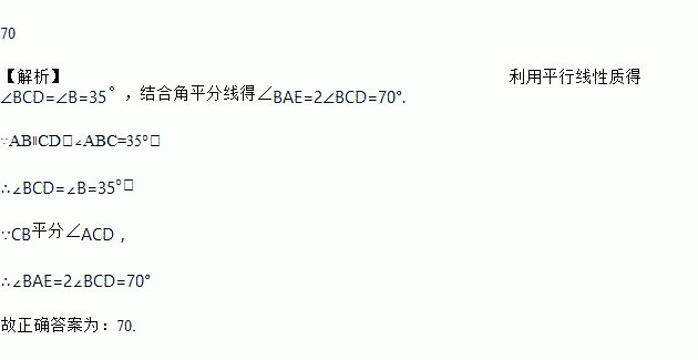 如图,AB∥CD,CB平分∠ACD,∠ABC=35°,则∠BAE=__________度.