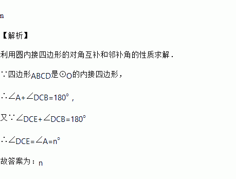如图:四边形ABCD内接于⊙O,E为BC延长线上一点,若∠A=n°,则∠DCE=_____°.