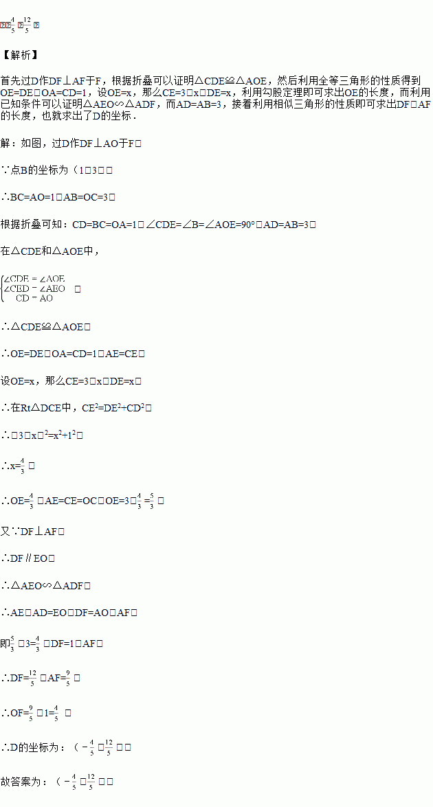 如图.在直角坐标系中,矩形ABCO的边OA在x轴上,边OC在y轴上,点B的坐标为(1,3),将矩形沿对角线AC翻折,B点落在D点的位置,且AD交y轴于点E.那么点D的坐标为______.