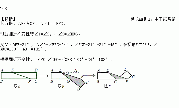 如图a是长方形纸带,∠DEF=24°,将纸带沿EF折叠成图b,再沿BF折叠成图c,则图c中的∠CFE的度数是 .