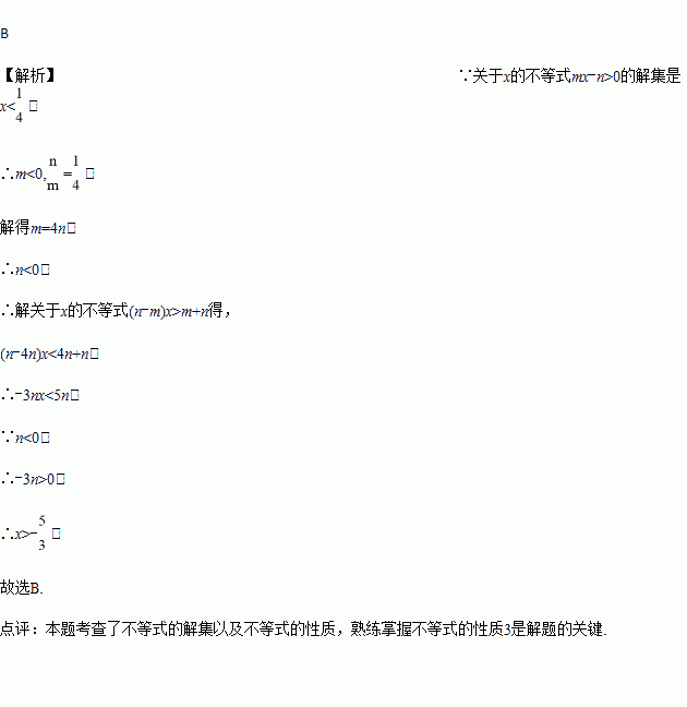 若关于x的不等式mx﹣n>0的解集是x<,则关于x的不等式(n﹣m)x>(m+n)的解集是( )