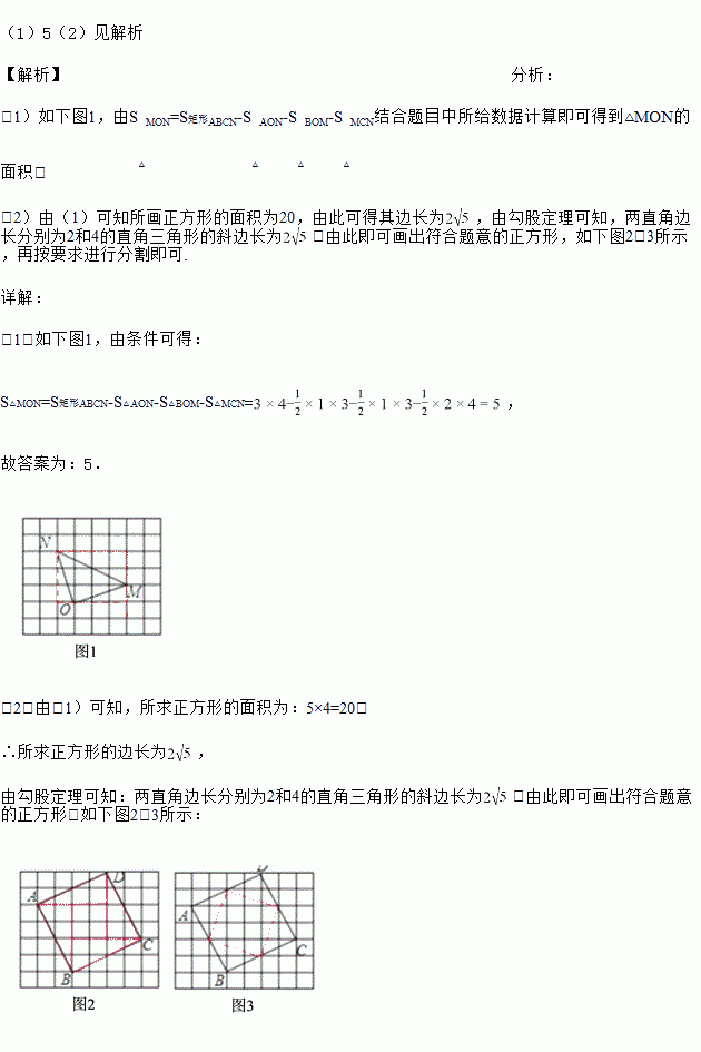 (2)在图②③中以格点为顶点画出一个正方形ABCD,使正方形ABCD的面积等于(1)中△MON面积的4倍,并将正方形ABCD分割成以格点为顶点的四个全等的直角三角形和一个正方形,且正方形ABCD的面积没有剩余(在图②、图③中画出的图形不能是全等形)