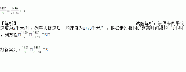 已知甲、乙两地间的铁路长1480千米,列车大提速后,平均速度增加了70千米/时,列车的单程运行时间缩短了3小时.设原来的平均速度为x千米/时,根据题意,可列方程为______________.