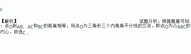 C 【解析】试题分析:根据题意可知:点O到AB、AC和BC的距离相等,则点O为三角形三个内角角平分线的交点,即点O为△ABC的内心,故选C.