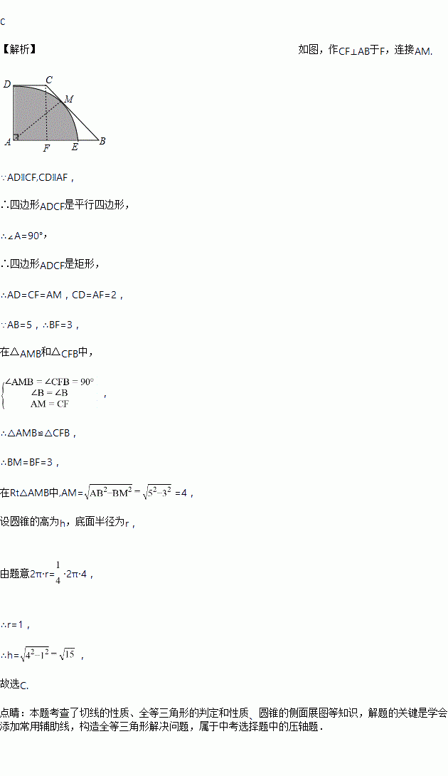 如图,在四边形ABCD中,AB∥CD,∠A=90º,AB=5,CD=2.以A为圆心,AD为半径的圆与BC边相切于点M,与AB交于点E,将扇形A-DME剪下围成一个圆锥,则圆锥的高为( )