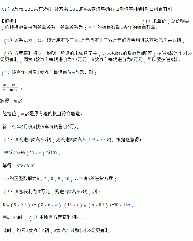 (2)为了增加收入,汽车销售公司决定再经销同品牌的B款汽车,已知A款汽车每辆进价为7.5万元,B款汽车每辆进价为6万元,公司预计用不多于105万元且不少于99万元的资金购进这两款汽车共15辆,有几种进货方案?