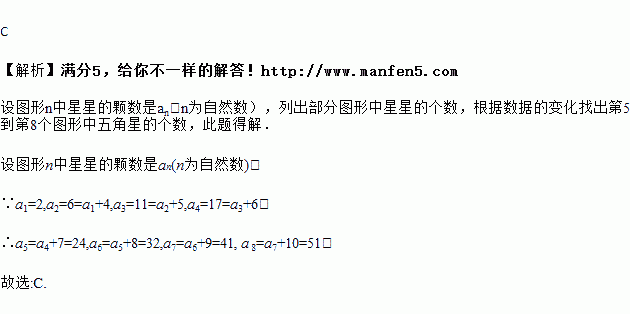 观察下列一组图形,其中图形①中共有2颗星,图形②中共有6颗星,图形③中共有11颗星,图形④中共有17颗星,…,按此规律,图形⑧中星星的颗数是( )