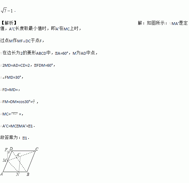 如图,在边长为2的菱形ABCD中,∠A=60°,M是AD边的中点,N是AB边上一动点,将△AMN沿MN所在的直线翻折得到△A′MN,连接A′C. 则A′C长度的最小值是 .