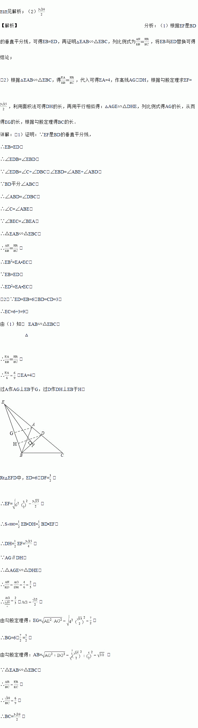 (2)若ED=6,BD=CD=3,求BC的长.