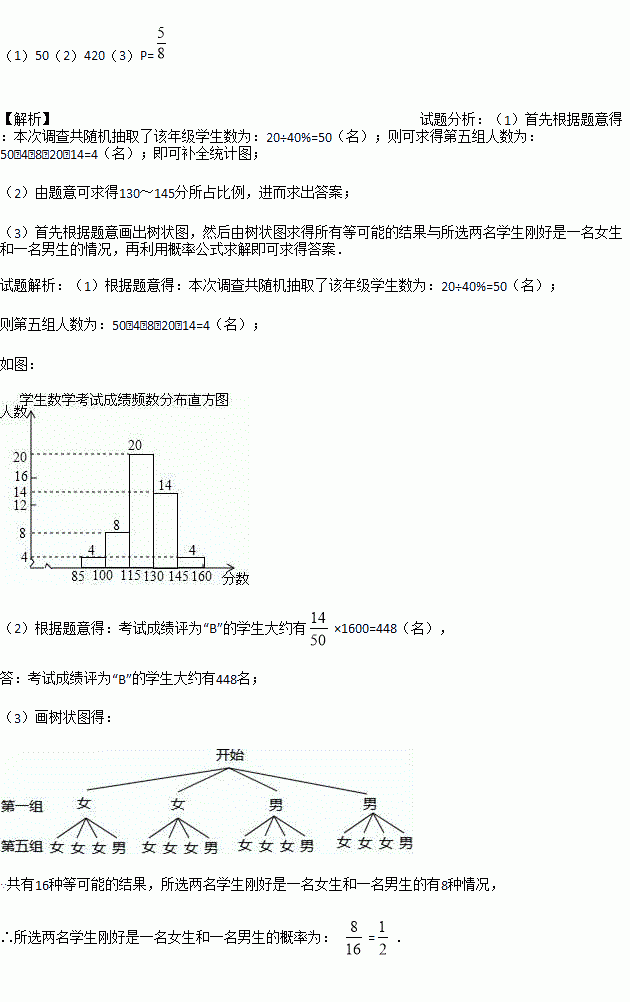 £¨2£©Èô½«µÃ·Öת»¯ÎªµÈ¼¶£¬¹æ¶¨£ºµÃ·ÖµÍÓÚ100·ÖÆÀΪ¡°D¡±£¬100¡«130·ÖÆÀΪ¡°C¡±£¬130¡«145·ÖÆÀΪ¡°B¡±£¬145¡«160·ÖÆÀΪ¡°A¡±£¬ÄÇô¸ÃÄê¼¶1600ÃûѧÉúÖУ¬¿¼ÊԳɼ¨ÆÀΪ¡°B¡±µÄѧÉú´óÔ¼ÓжàÉÙÃû£¿