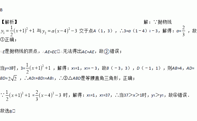 B 【解析】【解析】 ∵抛物线与交于点A(1,3),∴3=a(1﹣4)2﹣3,解得:a=,故①正确; ∵E是抛物线的顶点,∴AE=EC,∴无法得出AC=AE,故②错误; 当y=3时,3=,解得:x1=1,x2=﹣3,故B(﹣3,3),D(﹣1,1),则AB=4,AD=BD=,∴AD2+BD2=AB2,∴③△ABD是等腰直角三角形,正确; ∵=时,解得:x1=1,x2=37...