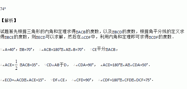 如图,△ABC中,∠A = 40°,∠B = 72°,CE平分∠ACB,CD⊥AB于D,DF⊥CE,则∠CDF =_________度.