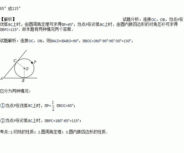 如图,AB、AC与⊙O相切于点B、C,∠A=50°,P为⊙O上异于B、C的一个动点,则∠BPC的度数为__________.