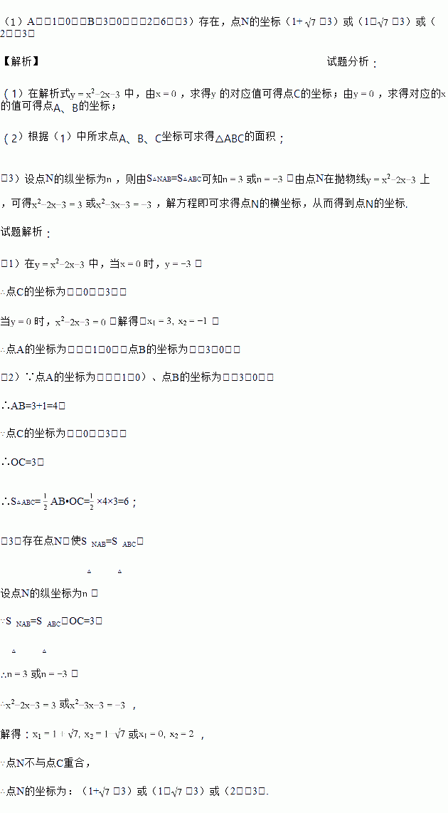 (1)A(﹣1,0)、B(3,0);(2)6;(3)存在,点N的坐标(1+ ,3)或(1﹣,3)或(2,﹣3) 【解析】试题分析: (1)在解析式中,由,求得的对应值可得点C的坐标;由,求得对应的的值可得点A、B的坐标; (2)根据(1)中所求点A、B、C坐标可求得△ABC的面积; (3)设点N的纵坐标为,则由S△NAB=S△ABC可知或,由点N在抛物线上,可得或,解方程即...