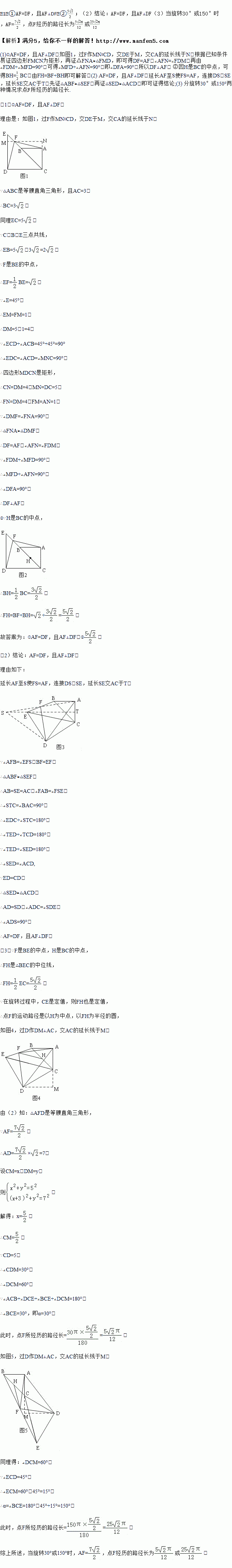 (2)将图(1)中的△CDE绕C点逆时针旋转a(如图2,0°<α<180°),试确定AF与DF的关系,并说明理由;