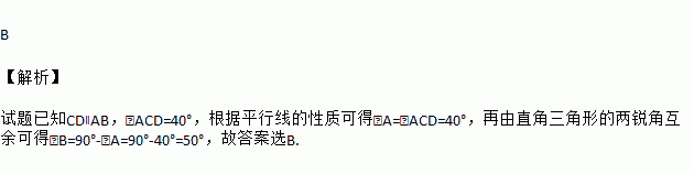 如图,在△ABC中,∠ACB=90º,CD∥AB,∠ACD=40º,则∠B的度数为()