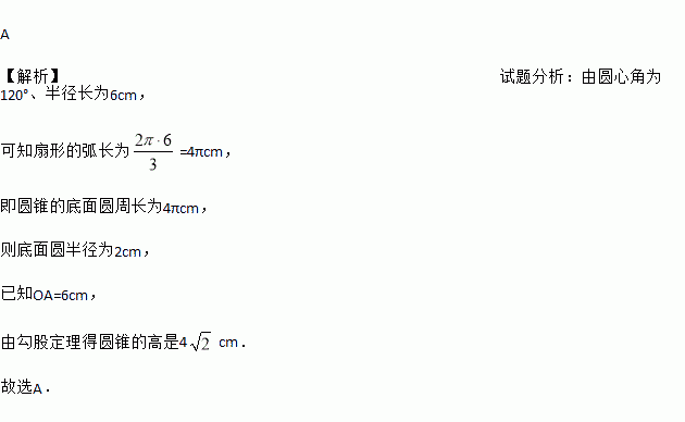 如图,有一圆心角为120°、半径长为6 cm的扇形,若将OA、OB重合后围成一圆锥侧面,那么圆锥的高是( )
