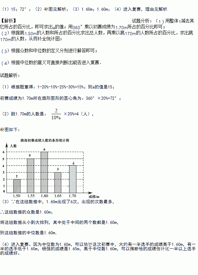 扇形统计图中a= ,初赛成绩为1.70m所在扇形图形的圆心角为