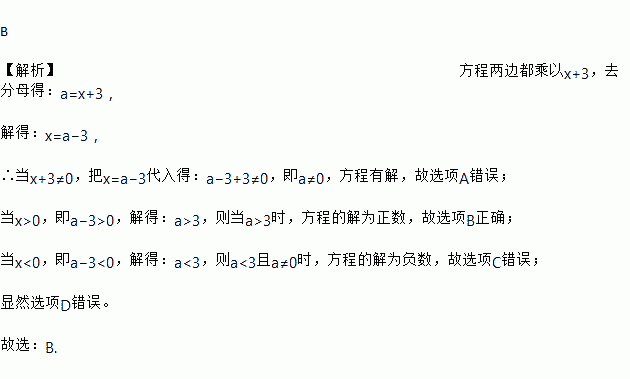 B 【解析】方程两边都乘以x+3,去分母得:a=x+3, 解得:x=a?3, ∴当x+3≠0,把x=a?3代入得:a?3+3≠0,即a≠0,方程有解,故选项A错误; 当x>0,即a?3>0,解得:a>3,则当a>3时,方程的解为正数,故选项B正确; 当x<0,即a?3<0,解得:a<3,则a<3且a≠0时,方程的解为负数,故选项C错误; 显然选项D错误。 ...