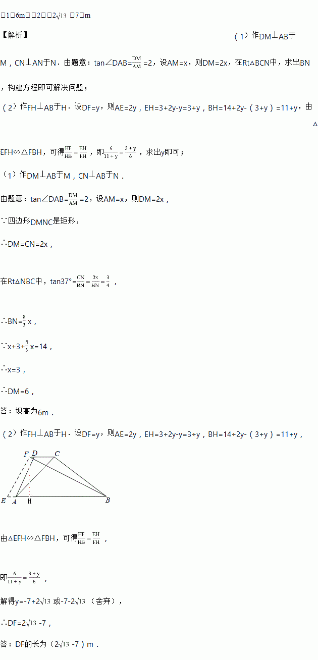 如图1,水坝的横截面是梯形ABCD,∠ABC=37°,坝顶DC=3m,背水坡AD的坡度i(即tan∠DAB)为1:0.5,坝底AB=14m.